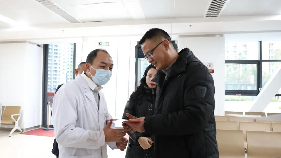 在慰问过程中,杨坤与医护人员亲切交流,关切询问三个科室在管住院患者及春节期间医护人员排班情况,并肯定他们在过去一年医院搬迁运营及发展中作出的努力。同时,高度赞扬他们坚守岗位、守护群众健康的奉献精神,并为他们送上新春祝福。杨坤希望,驻岗医护人员在春节期间加强值班值守,注意秋冬季节呼吸道传染病预防,做好医疗保障服务,若出现突发情况及时上报处理。同时,希望在新的一年里,医院能够再接再厉,锚定卫生健康事业高质量发展目标,推进重点学科及省级区域医疗中心建设,勇担健康使命,铸就时代新功,努力践行以人民为中心的发展思想,聚焦影响群众看病就医感受的问题,切实提升医疗服务质量,不断改善患者就医体验,为全市人民群众提供更加优质高效的医疗卫生服务。