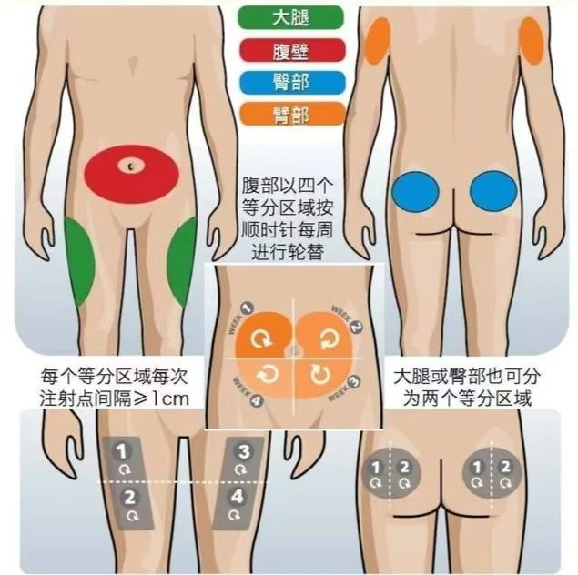 1.轮换注射部位:为避免重复在一个部位长期注射而引起的注射部位皮下脂肪增生或萎缩,应定期进行对称的轮流注射,可以采用两种方法进行:一种是按照左边一周、右边一周的方法进行;另一种是一次左边,一次右边,部位对称轮换。在同一注射部位内的轮换,每次注射点应间隔至少一个指节的距离,且尽量避免一个月内重复使用同一个注射点。